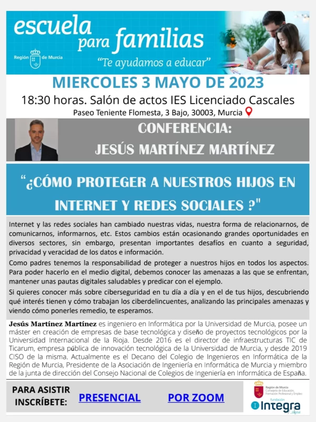 La Escuela para Familias, de la Consejería de Educación, Formación Profesional y Empleo, ha programado para el miércoles 3 de mayo la charla gratuita '¿Cómo proteger a nuestros hijos en internet y redes sociales?', que ofrecerá el ingeniero en Informática Jesús Martínez.