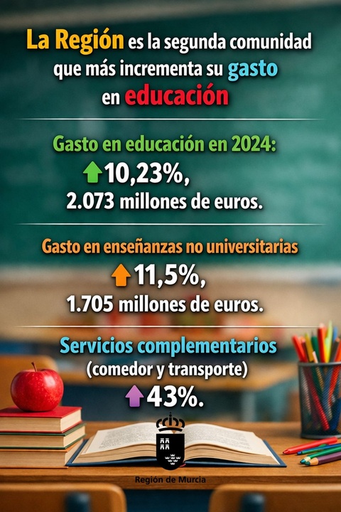 El gasto público en educación en 2024 fue de 2.073 millones de euros, un 10,23 por ciento más que el año anterior, lo que sitúa a la Región en los primeros puestos en cuanto a incremento de inversión en materia de educación, solo por detrás de la Comunidad Valenciana, donde aumentó un 11,8 por ciento, y delante de regiones como Castilla y León, Aragón y País Vasco.