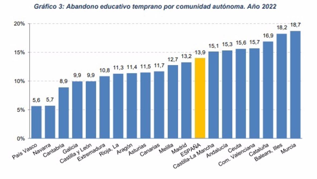 En cuanto a la situación del abandono temprano de la educación y la formación en 2022 por comunidad autónoma, los datos, recogidos en la Encuesta de Población Activa del Instituto Nacional de Estadística, muestran que "se mantienen diferencias significativas".