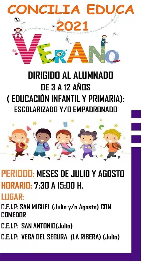 El servicio Concilia Educa Verano es uno de los servicios de conciliación que presta la Concejalía de Igualdad a las familias con menores escolarizados de edades comprendidas entre los 3 y los 12 años, de lunes a viernes, desde las 7.30 a las 15.00 horas.