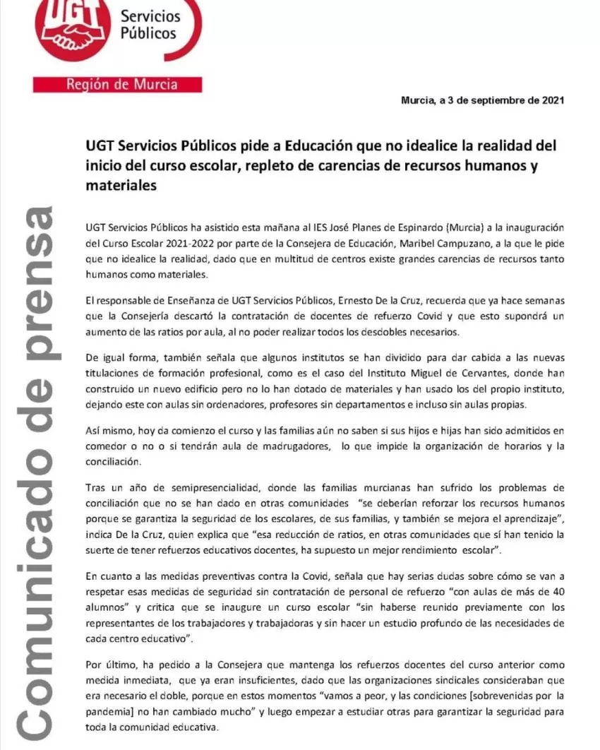 UGT Servicios Públicos ha asistido esta mañana al IES José Planes de Espinardo (Murcia) a la inauguración del Curso Escolar 2021-2022 por parte de la Consejera de Educación, Maribel Campuzano, a la que le pide que "no idealice la realidad, dado que en multitud de centros existe grandes carencias de recursos tanto humanos como materiales".