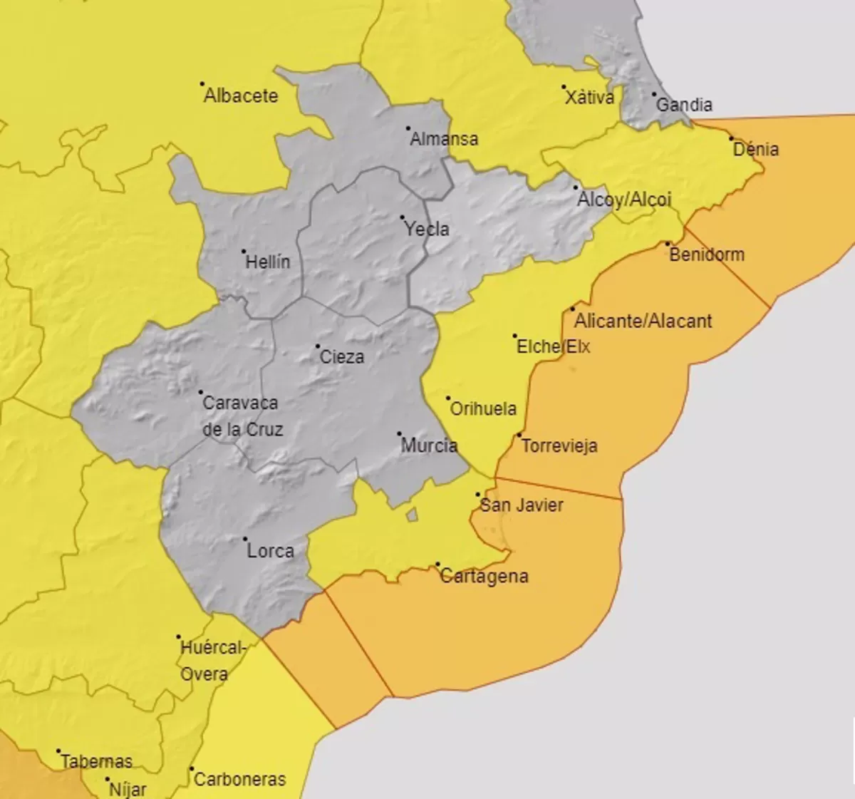 Por su parte, en el Valle del Guadalentín, Lorca y Águilas, la Aemet ha emitido un aviso de fenómenos costeros por vientos de 50 a 60 kilómetros por hora y olas de 3 metros entre las 12.00 y las 17.59 horas. Desde esa hora hasta las 23.59, el viento podrá alcanzar los 70 kilómetros por hora.