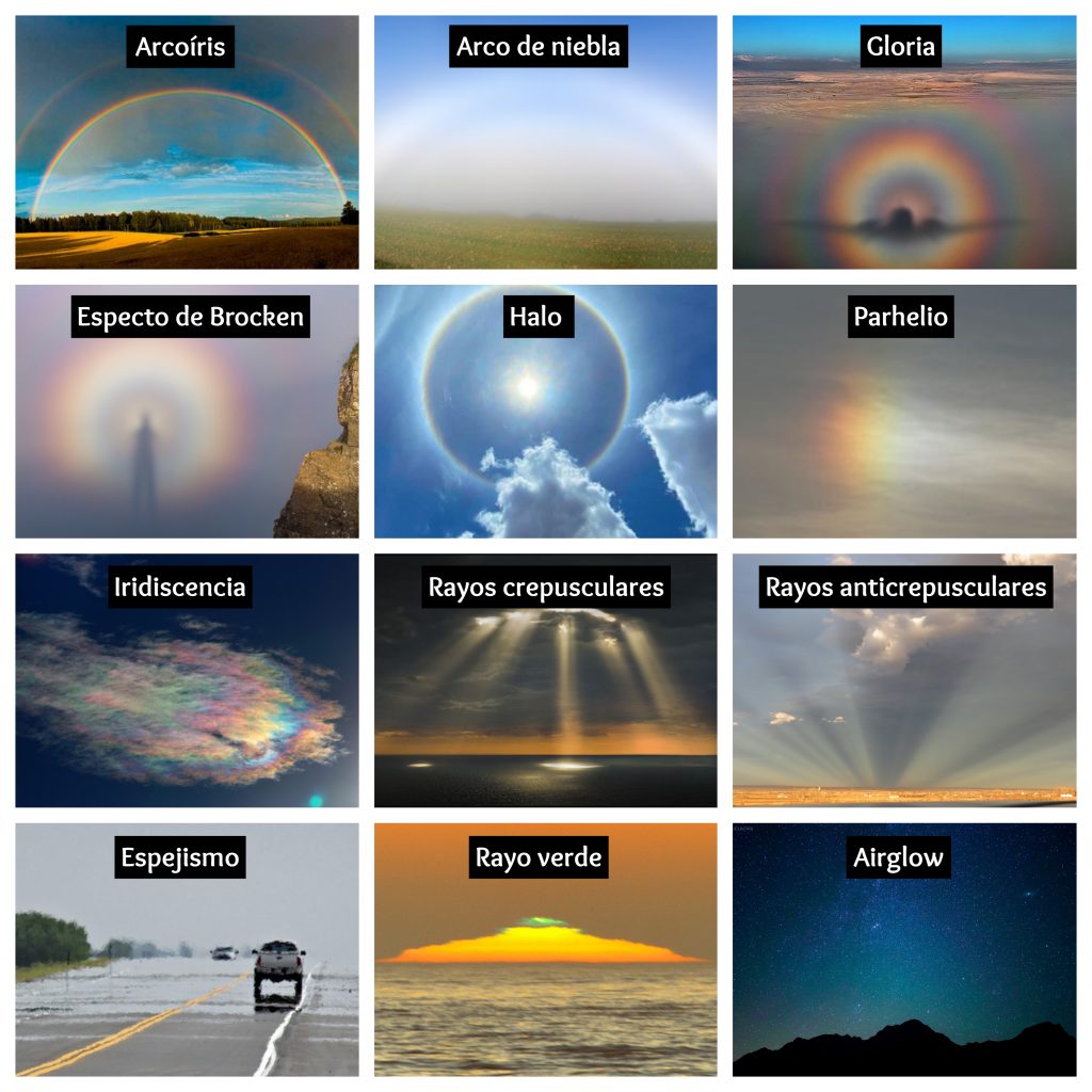 iridiscencia, rayos crepusculares y anticrepusculares, espejismo, rayo verde y airglow. A