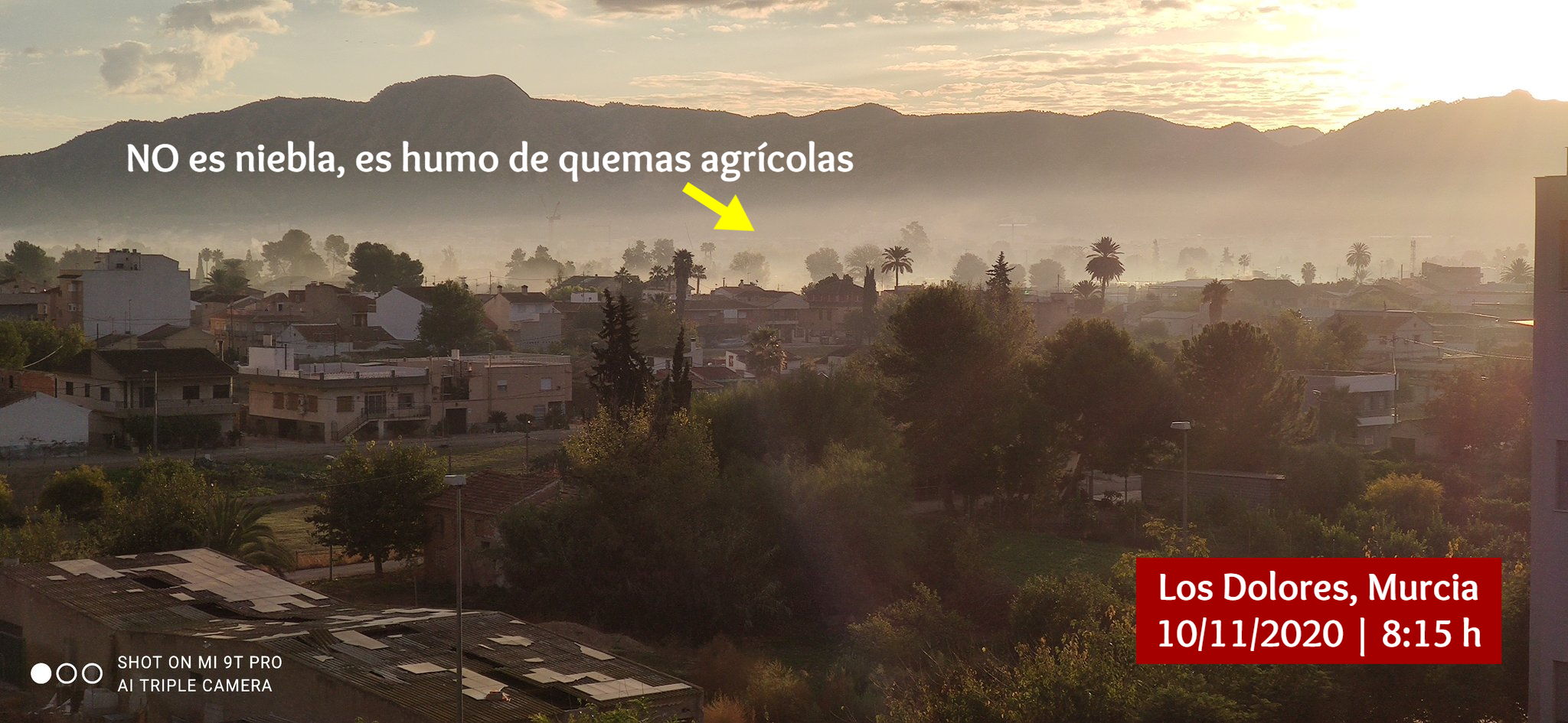 Es inadmisible la boina de contaminación que se aprecia mañana tras mañana en el entorno de la ciudad de Murcia y otros puntos cercanos, asociada a las quemas agrícolas. También se le llama "smog", palabra que proviene del inglés, y que es una mezcla de "smoke" y "fog" (humo y niebla). Recibe esa denominación porque semeja una niebla sucia, producida por la contaminación ambiental.