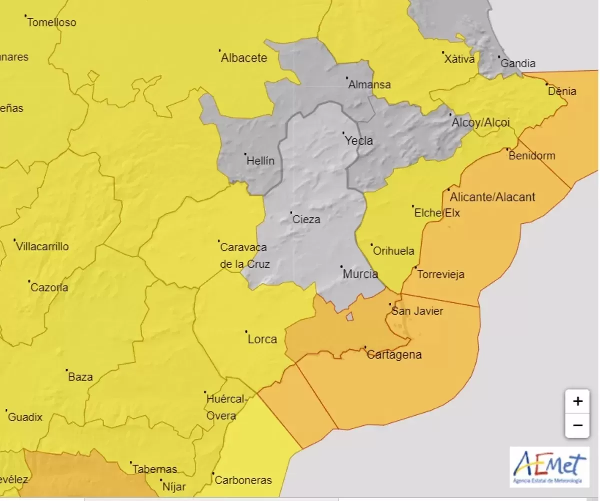 Por su parte, en el Noroeste, Valle del Guadalentín, Lorca y Águilas, el aviso amarillo por vientos estará activo desde las 12.00 horas y hasta las 23.59 horas del jueves.