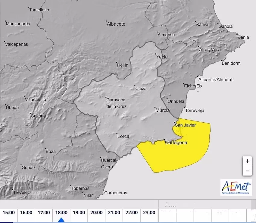 La Agencia Estatal de Meteorología (Aemet) ha emitido para la tarde del sábado un boletín de aviso amarillo por fenómenos meteorológicos adversos de nivel amarillo por fenómenos costeros en la zona del Campo de Cartagena y Mazarrón.
