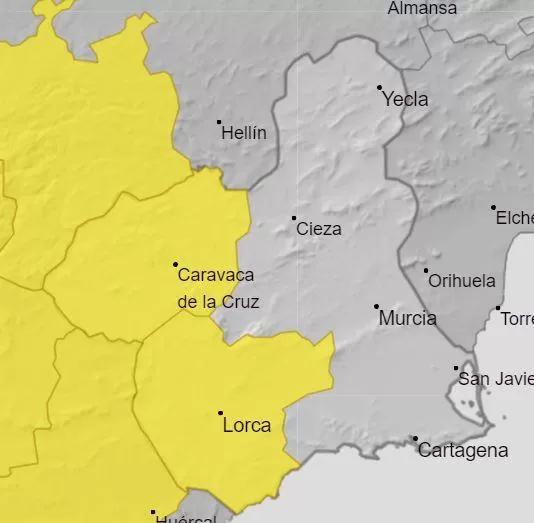 La Agencia Estatal de Meteorología (Aemet) ha establecido el aviso de nivel amarillo --que significa riesgo por fenómenos meteorológicos adversos-- por tormentas en el Noroeste y en el Valle del Guadalentín, Lorca y Águilas.
