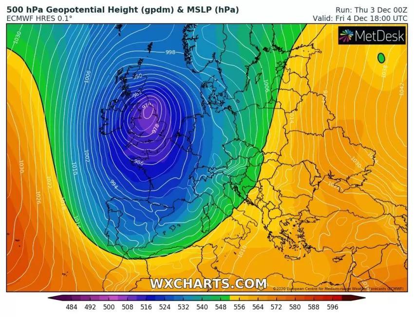 Mapa a 500 hPa (5500 metros) previsto para el viernes 4 de diciembre de 2020 a las 18 UTC Véase la entrada de una masa de aire polar ártica a la Península Ibérica y Baleares. [Fuente: WXCharts].
