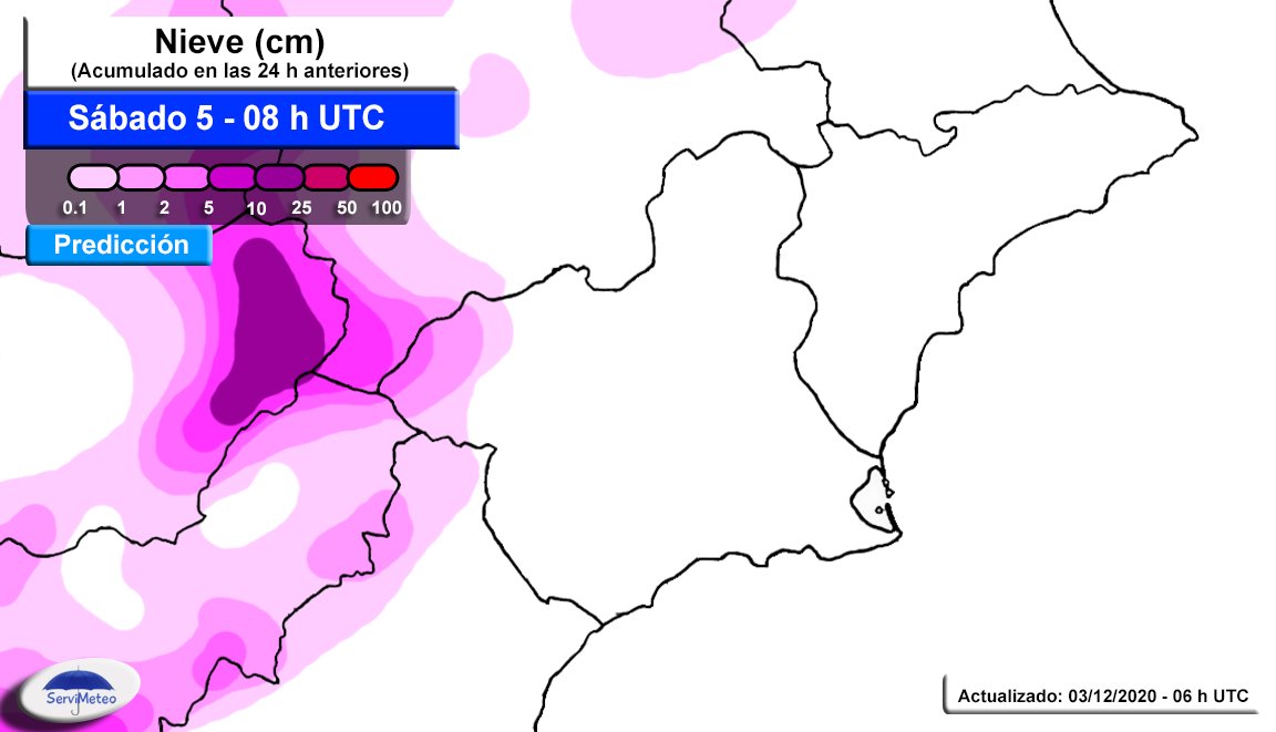 Mapa de acumulación de nieve (cm) previsto para el viernes 4 de diciembre de 2020 en el sureste peninsular. [Fuente: Servimeteo].