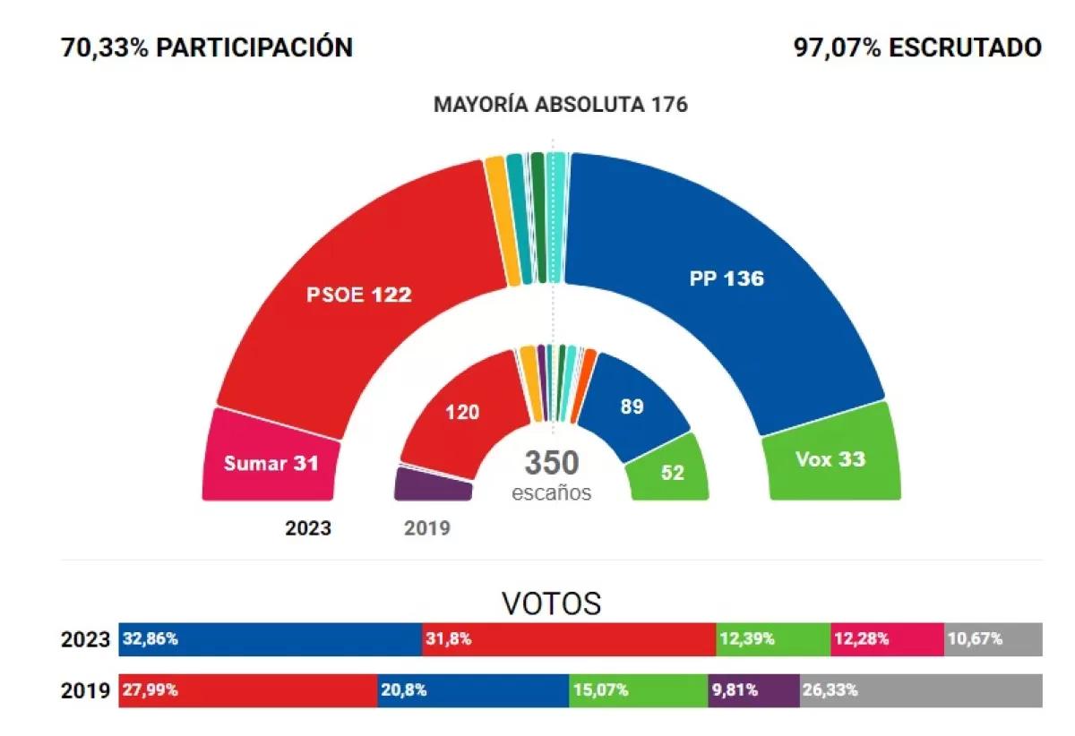 Según los resultados de las elecciones celebradas hoy, es posible que se presente un bloqueo en la gobernabilidad del país, ya que los candidatos del Partido Popular (PP) y el Partido Socialista Obrero Español (PSOE) no obtienen los escaños suficientes para ser investidos como presidentes del gobierno de forma clara. Alberto Núñez Feijóo, el candidato del PP, ha ganado las elecciones generales, pero no ha alcanzado las expectativas esperadas. Aunque obtuvo la victoria, no cuenta con el apoyo suficiente de Vox, lo que le impediría formar gobierno.