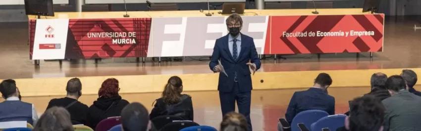 El programa de actos se inició con la conferencia 'Rick y Morty y la toma de decisiones' a cargo de Cristóbal Gázquez (COO de BGD Abogados). A continuación, el consejero de Economía, Hacienda y Administración Digital, Luis Marín, pronunció el pregón de las fiestas, que arrancó agradeciendo a la Comisión de Fiestas su elección como pregonero, elección que le hizo gran ilusión, no en vano el mismo fue subdelegado de la Facultad en sus años de estudiante de Ciencias Económicas y Empresariales en la UMU, cuando la Facultad se encontraba en la Avda. Ronda de Levante de Murcia, y durante 15 años ha sido profesor asociado de la UMU impartiendo docencia en la actual Facultad en el Campus de Espinardo.