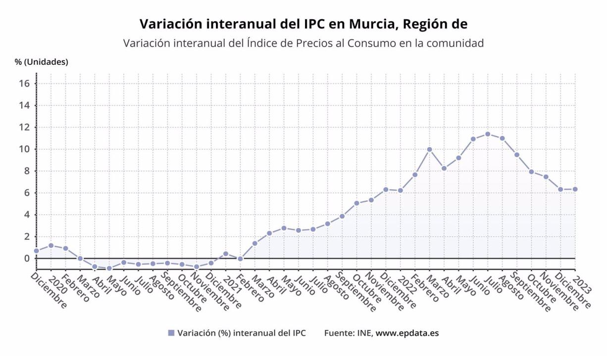 La tasa interanual de la Región de Murcia (6,3%) es superior a la media de España (5,9%), en un ranking liderado por Castilla-La Mancha y Melilla (6,9%) y Extremadura y Ceuta (6,6%).