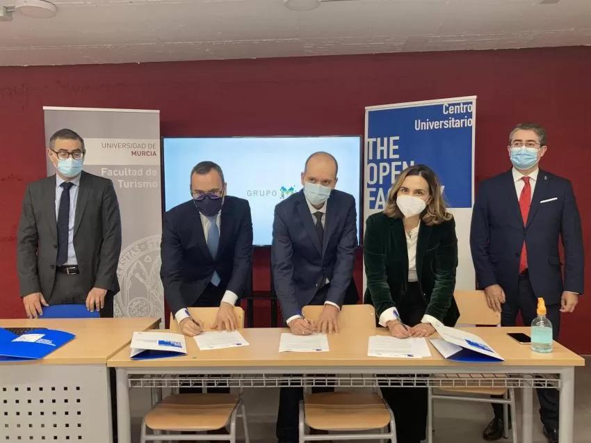 El CEO de la promotora Grupo Moraval, Álvaro Soto de Scals, y los directivos del Centro Universitario The Open Faculty ( sede de la Facultad de Turismo de la UMU ), Onofre Martínez y Pilar López, han firmado un acuerdo de adscripción que dará a los alumnos de la un acceso preferente a la nueva residencia que la empresa construirá en la capital murciana y que tiene previsto abrir sus puertas para el año académico 2024-2025.