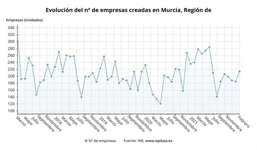 El número de nuevas sociedades mercantiles descendió en la Región de Murcia un 10,8% en febrero respecto al mismo mes de 2021, la tercera mayor caída por comunidades, hasta las 214 empresas, según los datos difundidos este martes por el Instituto Nacional de Estadística (INE).