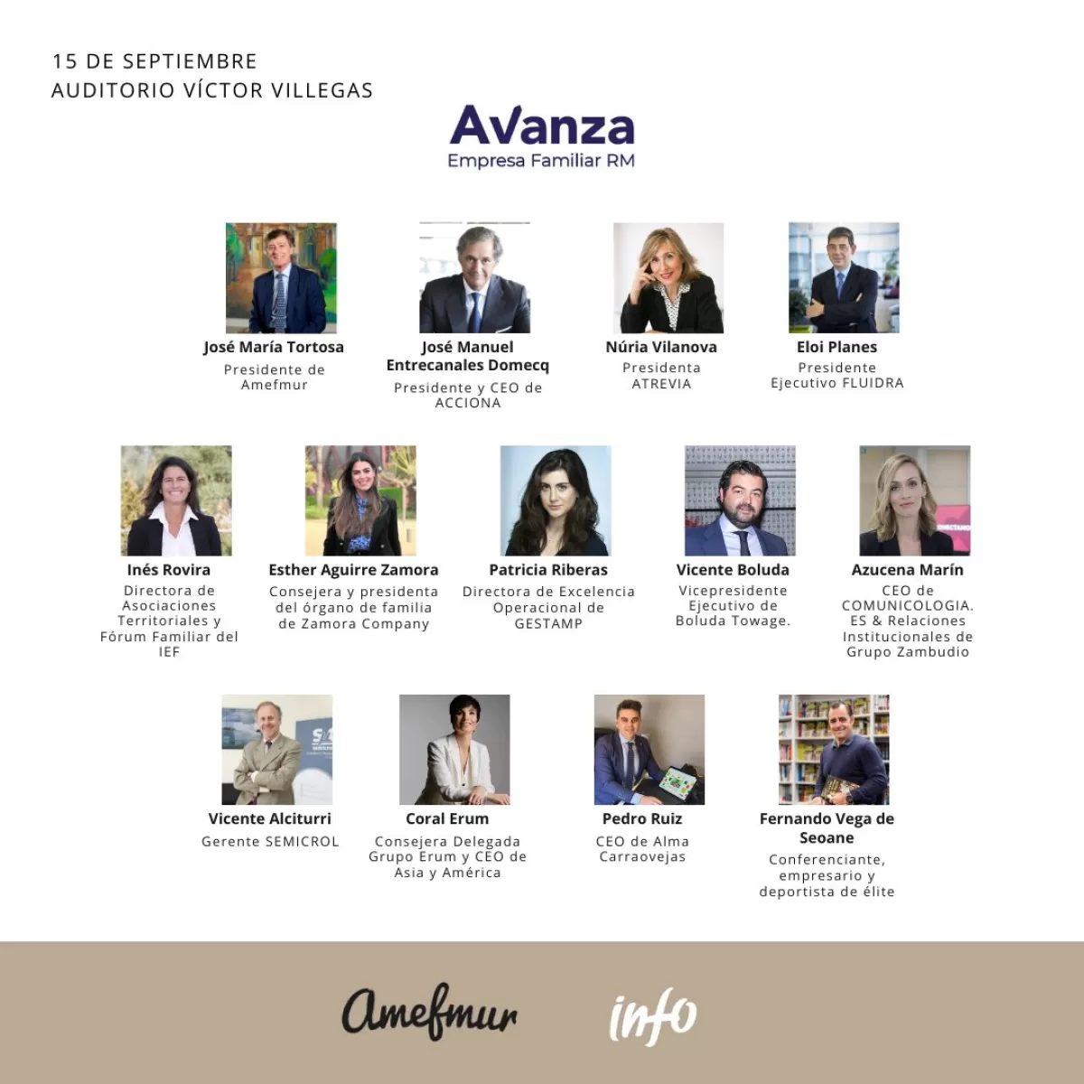 La apertura del evento será a las 9.15 horas y contará con los discursos de bienvenida del presidente de Amefmur, José María Tortosa, y el consejero de Economía, Hacienda y Empresa, Luis Alberto Marín. El encuentro también incluirá las ponencias de José Manuel Entrecanales (Acciona), Eloi Planes (Fluidra), Vicente Boluda (Boluda Towage), Patricia Riberas (GESTAMP) o Pedro Ruiz (Alma Carraovejas).