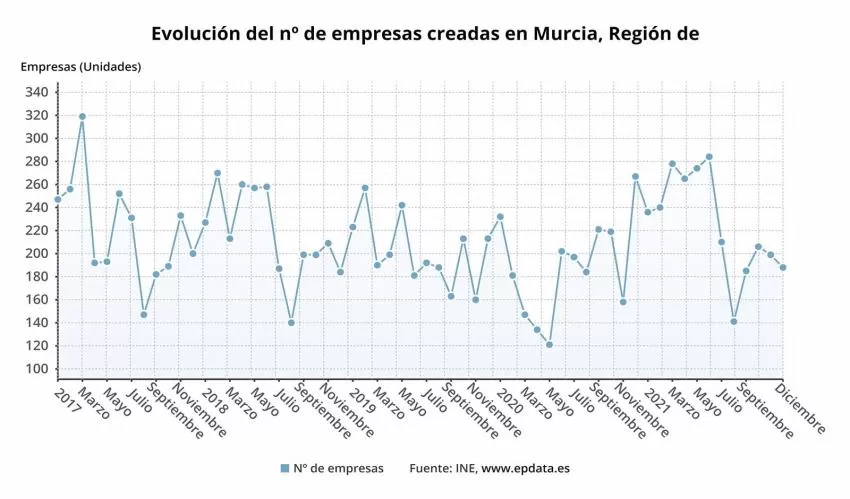 Respecto al mes de diciembre, en la Región de Murcia se crearon 188 sociedades mercantiles, un 29,6% menos que el mismo mes del año anterior, y se disolvieron 28, solo por delante de la Comunidad Foral de Navarra (5) y La Rioja (18). La variación anual en la Región fue del -3,4%.