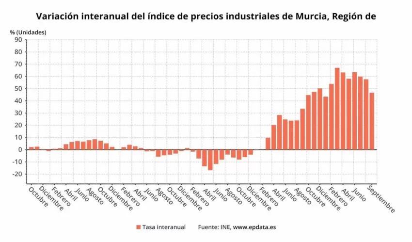 El Índice de Precios Industriales (IPRI) en la Región de Murcia ha aumentado un 46,6% en septiembre en relación al mismo mes de 2021, según ha informado este martes el Instituto Nacional de Estadística (INE).