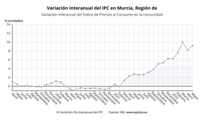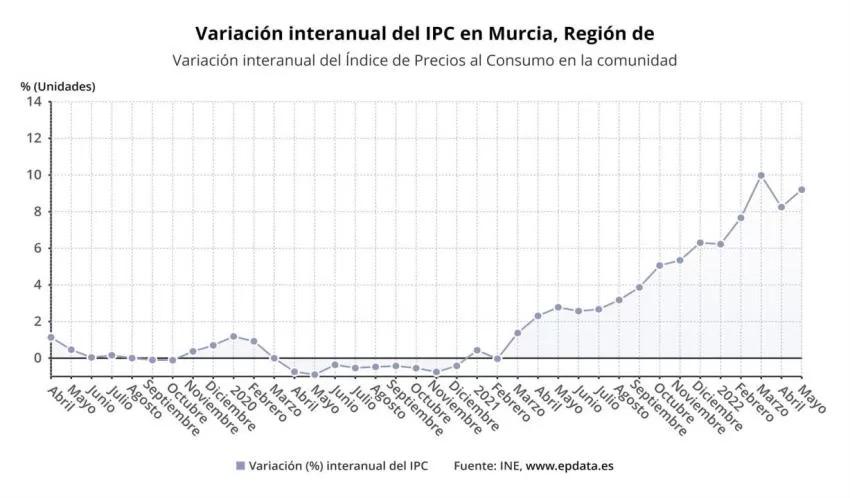 El Índice de Precios de Consumo (IPC) de la Región de Murcia subió un 1,8% en junio con respecto al mes anterior, el duodécimo mayor incremento de todas las comunidades autónomas, mientras que en términos internuales aumentó un 10,9%, según datos difundidos este miércoles por el Instituto Nacional de Estadística (INE) y recogidos por Europa Press.