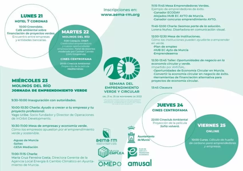 Murcia albergará, del 21 al 25 de noviembre, la 'Semana del Emprendimiento Verde y Circular', un evento organizado por la Concejalía de Empleo, Comercio y Mercados del Ayuntamiento de Murcia y la Asociación de Empresas de Medio Ambiente de la Región de Murcia (AEMA).