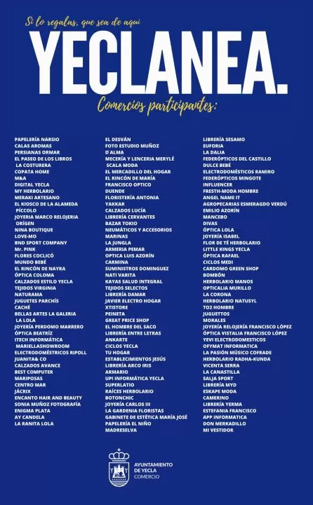 Vuelve la campaña 'Yeclanea', una nueva edición destinada al sector del comercio local y minorista de la ciudad de Yecla y que es la muestra del compromiso con el sector por parte del Ayuntamiento de Yecla.