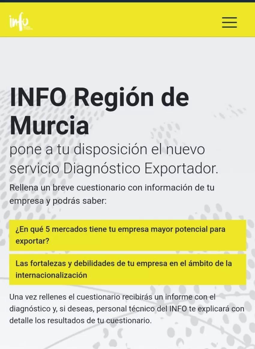 El Instituto de Fomento de la Región de Murcia (INFO) ha puesto en marcha una herramienta 'on line' denominada 'Diagnóstico Exportador', que, con un sencillo cuestionario, ofrece a las empresas pistas fiables sobre su capacidad exportadora, así como una selección de los cinco mercados donde tienen mayores posibilidades de éxito.