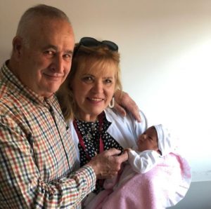 Emma entre los brazos de su abuela y el dedo de su abuelo