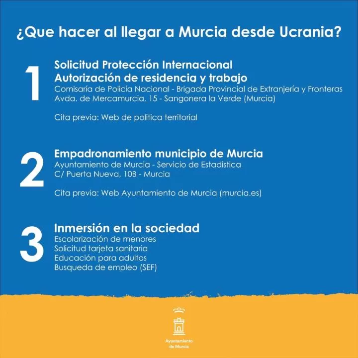El Ayuntamiento de Murcia, a instancias de la Concejalía de Mayores, Vivienda y Servicios Sociales, habilitará un canal informativo exclusivo de atención a refugiados ucranianos que estará disponible en la página web institucional, 'www.murcia.es', y en las redes sociales municipales.