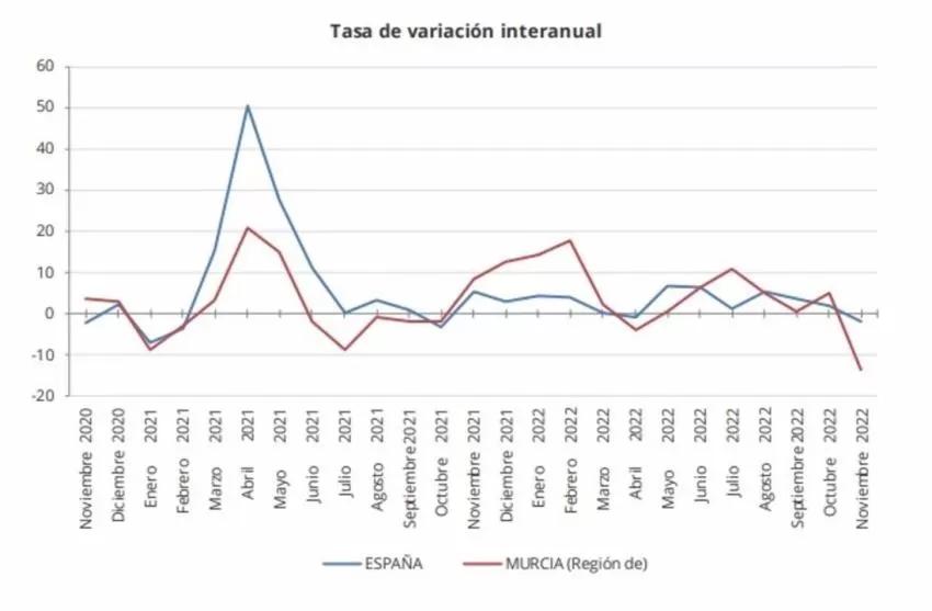 El Índice General de Producción Industrial (IPI) cayó en la Región de Murcia un 13,5% en noviembre respecto al mismo mes del año anterior, el mayor descenso por comunidades autónomas, según ha informado este miércoles el Instituto Nacional de Estadística (INE).
