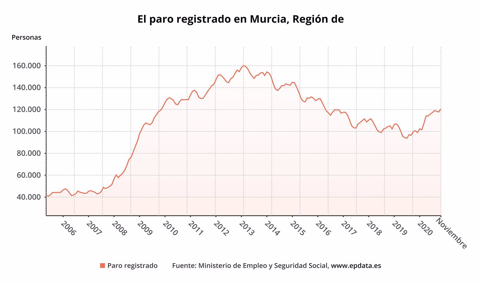 El número de desempleados registrados en las oficinas del Instituto Nacional de Empleo (Inem) en la Región de Murcia al término del mes de noviembre se situó en 120.608, lo que supone un aumento de 2.781 personas respecto a octubre, según datos difundidos este miércoles por el Ministerio de Trabajo y Economía Social.
