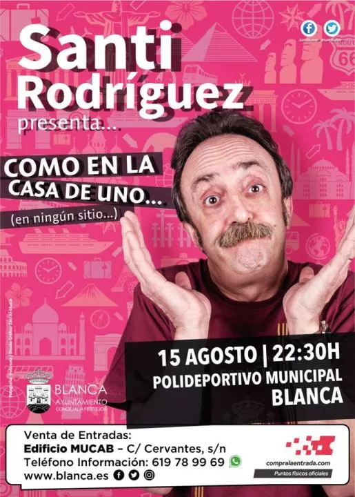 Santi Rodríguez llega a la programación de agosto en Blanca con su espectáculo Como en la casa de uno… (en ningún sitio). Un monólogo en el que habla, con mucho humor, de lo curioso de salir fuera, que te conviertes en guiri sin darte cuenta y los guiris dejan de serlo porque son de allí, de donde tú estás.