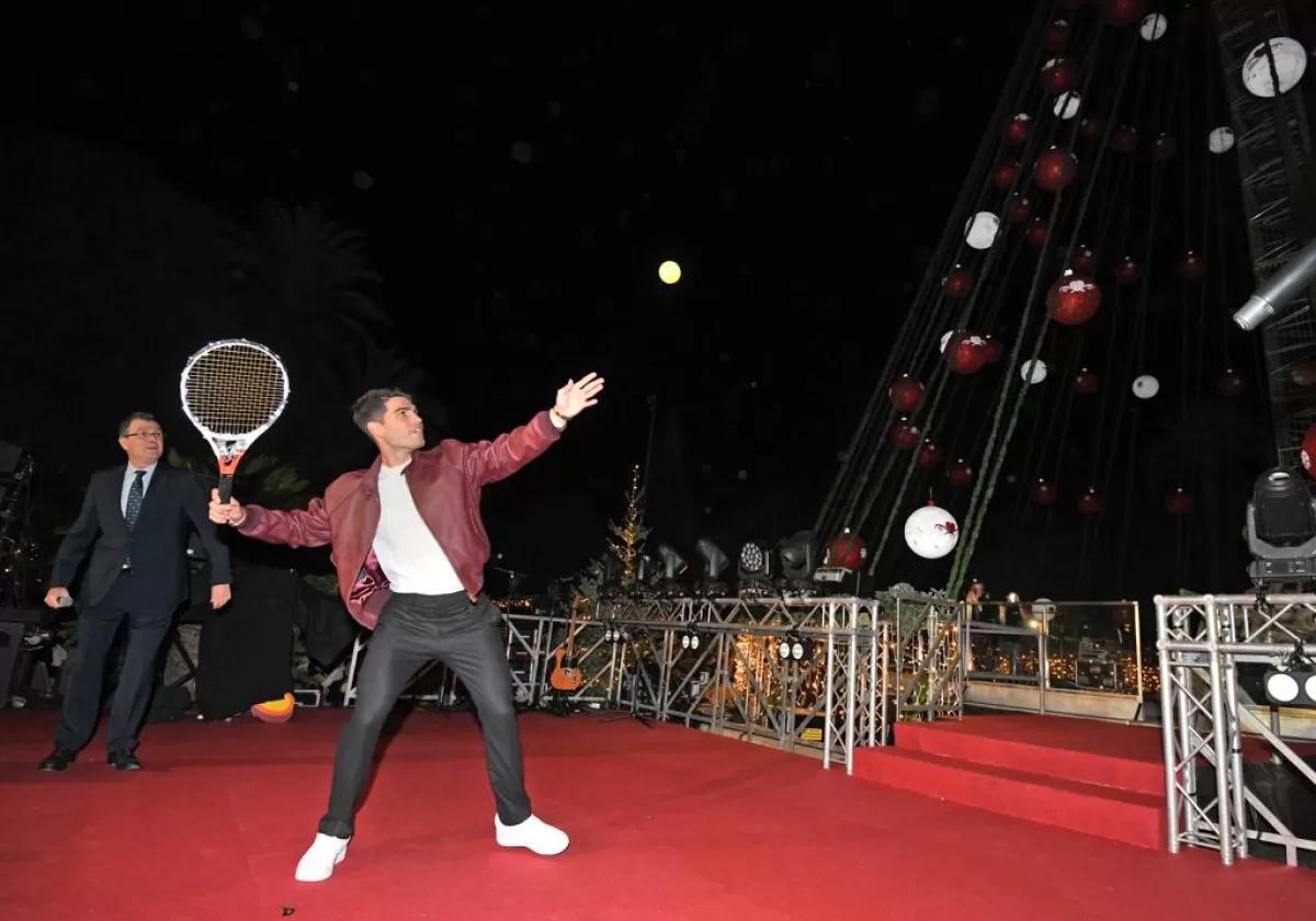 Y llegó el gran momento. El alcalde inició la cuenta atrás y la magia de Carlitos Alcaraz hizo el resto. El tenista cogió una raqueta de luces led y una bola luminosa, lanzando uno de sus característicos golpes mágicos en dirección al Gran Árbol, que seguidamente quedó iluminado, con la pelota de tenis lanzada por el número 2 del mundo colgada en su estructura.