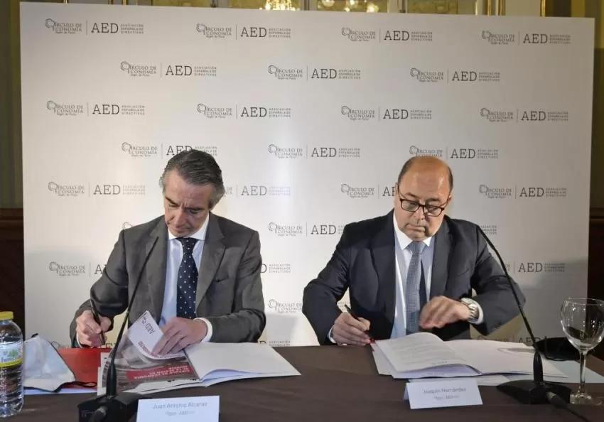 El convenio, formalizado este miércoles por el presidente del Círculo de Economía, Joaquín Hernández Muñoz, y el presidente de la AED, Juan Antonio Alcaraz, establece la adhesión del Círculo como socio institucional de la asociación, así como la incorporación de Hernández Muñoz a la Junta directiva de la AED. De esta manera, los socios del Círculo tendrán a su disposición una gama de servicios única y exclusiva enfocada a sus necesidades.