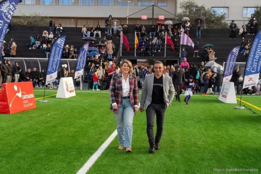 La alcaldesa, Noelia Arroyo, ha inaugurado este viernes 10 de febrero estas renovadas instalaciones, junto a cientos de niños que entrenan en ellas, vecinos de la barriada y otros miembros de la comunidad deportiva de Cartagena, con una gran fiesta que celebra el definitivo 'paso al verde' del Mundial 82.