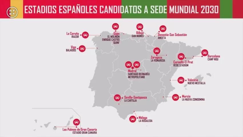 De estos quince estadios no todos formarían parte de la lista final de la candidatura ibérica, pues habría que compartir sedes con los estadios propuestos por la federación portuguesa de cara a esa cita de 2030.
