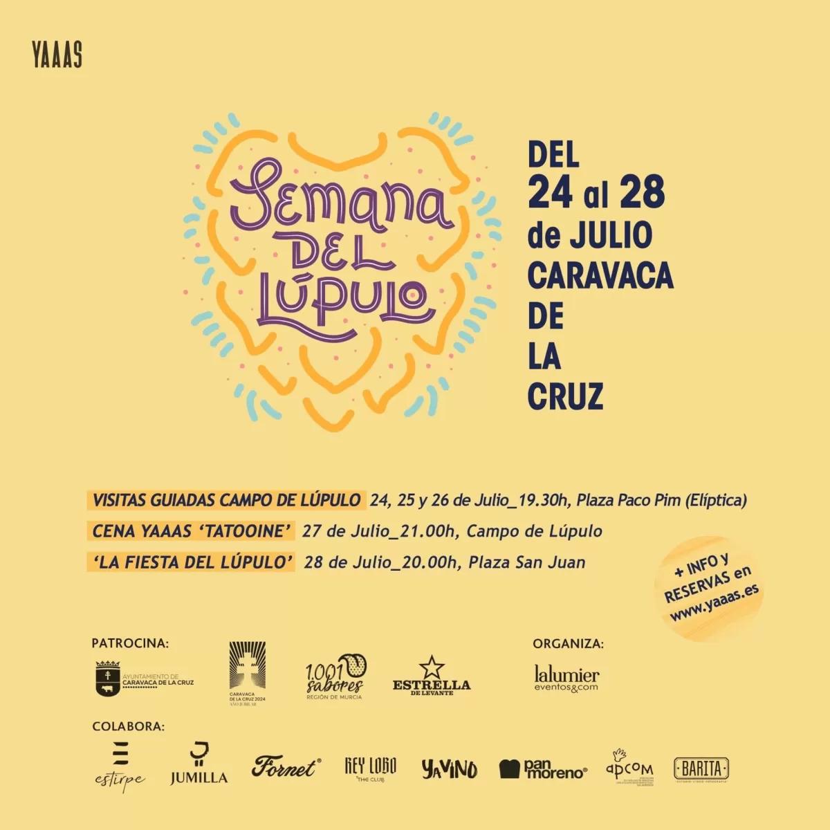 Tras el éxito de las ediciones anteriores, el Instituto de Turismo de la Región de Murcia (Itrem), el Ayuntamiento de Caravaca de la Cruz y Estrella Levante proponen nuevamente la celebración de la 'Semana del lúpulo', que podría convertirse en uno de los eventos gastronómicos del verano en la Región. Tendrá lugar del 24 al 28 de julio en los campos experimentales de la empresa cervecera en la zona e incluirá tres visitas guiadas a los cultivos acompañadas con catas, una cena y una fiesta de clausura.