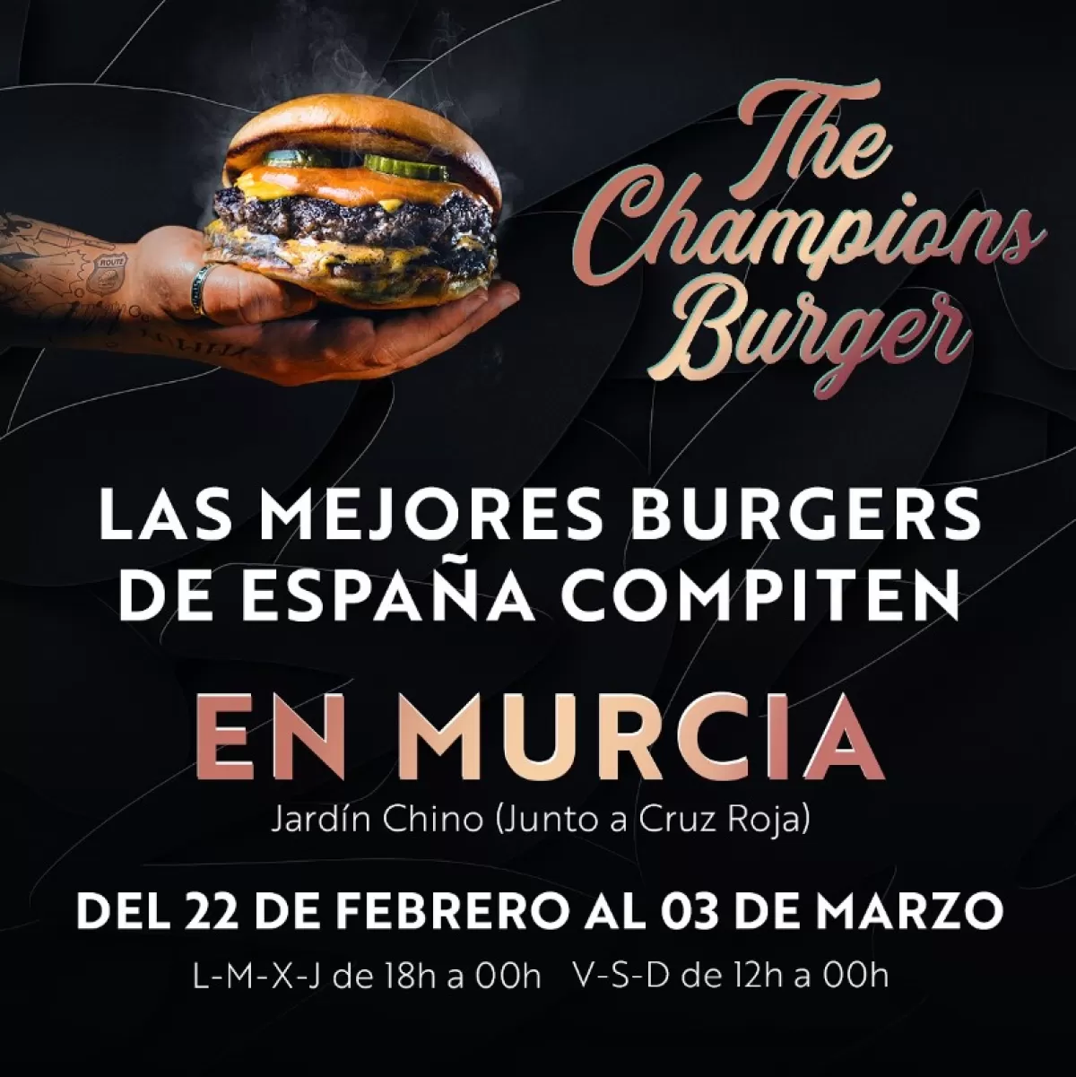 La entrada al recinto será libre durante los once días del festival ‘The Champions Burger', y se podrán degustar hamburguesas de locales tanto nacionales, como de Murcia. Algunas de los food trucks que estarán en el Jardín Chino son Soul Coffee Beer, Gottan, Circo, Umbrella, El Tarantín Chiflado, Torriko, Vacarnal y Nola Smoke.