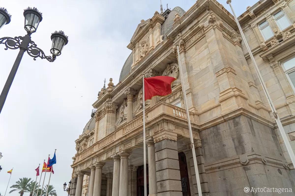 Los mástiles de respeto del Palacio Consistorial exhiben este miércoles una réplica de la bandera que se enarboló en el antiguo Ayuntamiento en 1873 para proclamar el Levantamiento Cantonal Español, que tuvo su epicentro en Cartagena.