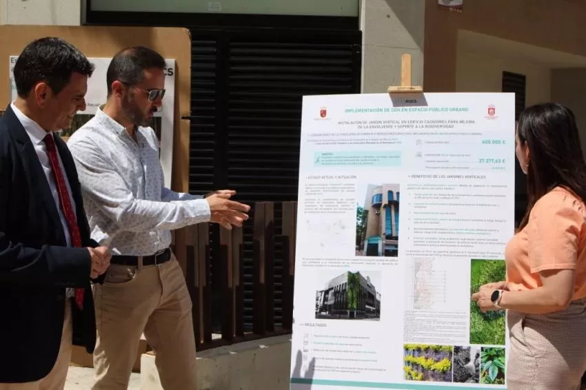 La Comunidad subvenciona la instalación de un jardín vertical en el edificio Cazadores de Yecla, que mejorará su envolvente y será soporte a la biodiversidad, ya que promueve el hábitat de aves y mariposas. El revestimiento vegetal de la esquina noroeste de este inmueble es una aplicación de una Solución Basada en la Naturaleza (SBN) que servirá de aislamiento térmico y acústico del cerramiento.