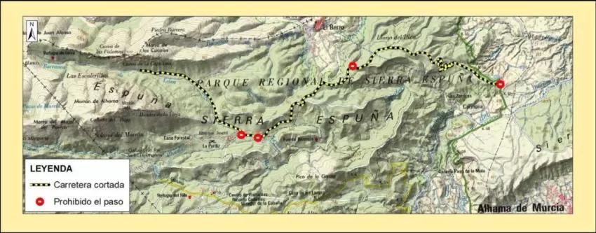 El tramo de carretera de ascenso a sierra Espuña a través de las denominadas Cuestas del Marqués dentro del parque regional ha quedado cerrado al tráfico de hasta este sábado, en el término municipal de Alhama de Murcia.
