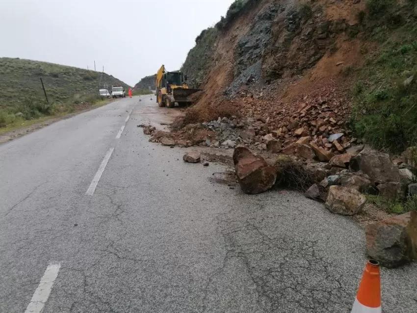 Efectivos de la Consejería de Fomento están retirando los desprendimientos caídos a consecuencia de las lluvias en el punto kilométrico 18 de la vía RM-332, que comunica Cartagena con Mazarrón.