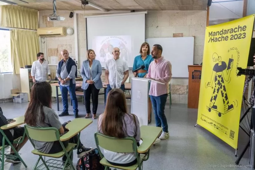 Los Premios Mandarache/Hache han presentado en el IES Carthago Spartaria su edición número 18 con un extenso y variado programa de actividades y encuentros con jóvenes de la ciudad en torno a los libros. Bajo el lema #Nopuedoparar y con un cartel diseñado por el taller Casa Chiribiri, las inscripciones de la edición de 2023 están abiertas hasta el 23 de diciembre.