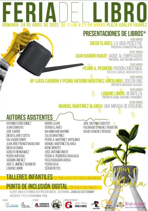 Además, seis autores locales presentarán sus libros a lo largo del día, desde las 11.00 horas, con Diego Clares y su obra 'La vida pedestre', Juan Ramón Barat a las 12.00 horas con 'Jaque al emperador', Pedro Pedreño a las 13.00 horas con 'Pasión Contenida', María Luisa Carrión y Pedro Antonio Martínez con 'Dos en uno' a las 18.00 horas, Louane Limón con 'Afonteza' a las 19.00 horas y Manuel Martínez a las 20.00 horas con 'Una mirada de ensueño'.
