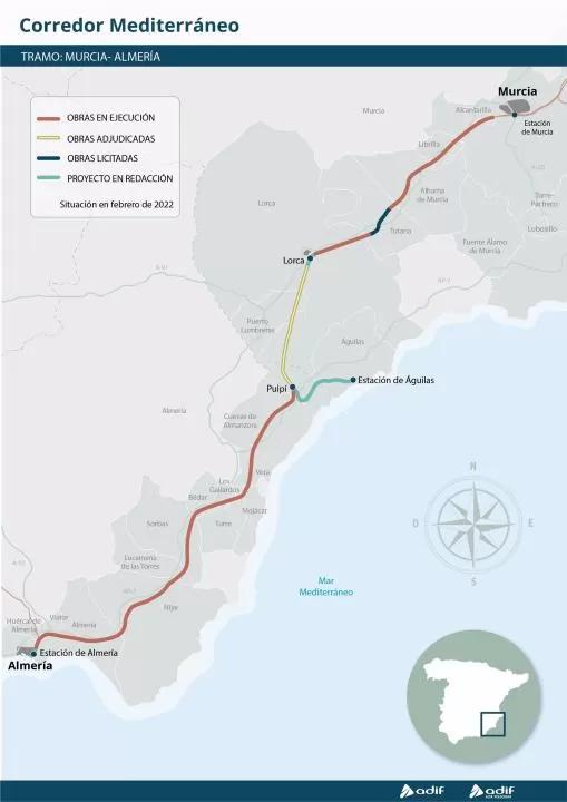 Según el gestor ferroviario, con esta licitación, todos los tramos entre Murcia y Almería se encuentran en obras o en fase de contratación (licitación o adjudicación), a excepción de la integración en el núcleo de Lorca.