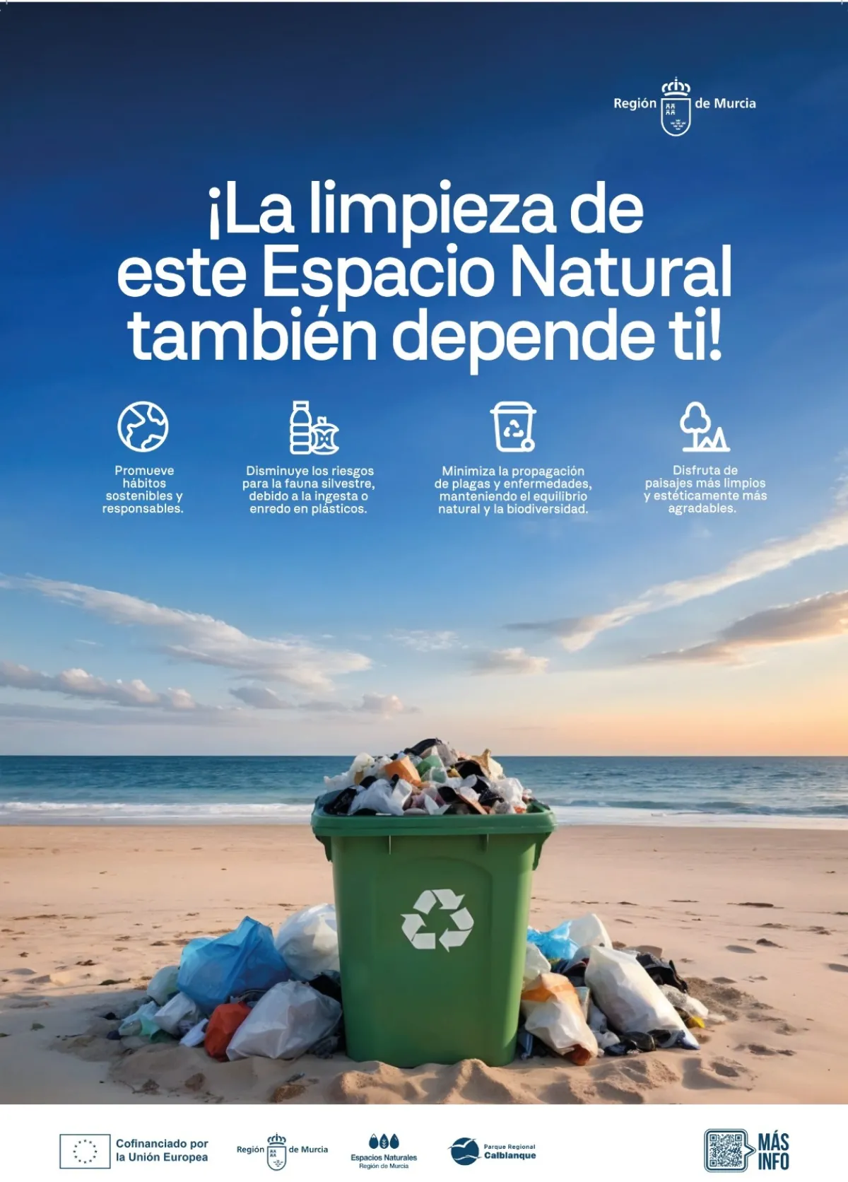 La campaña de concienciación comienza hoy y en ella se informa a todos los visitantes del Parque Regional de Calblanque, Monte de las Cenizas y Peña del Águila del próximo paso que se dará en enero de 2025 para avanzar en la progresiva retirada de todos los contenedores de basura del interior del espacio natural y de los beneficios de la medida.
