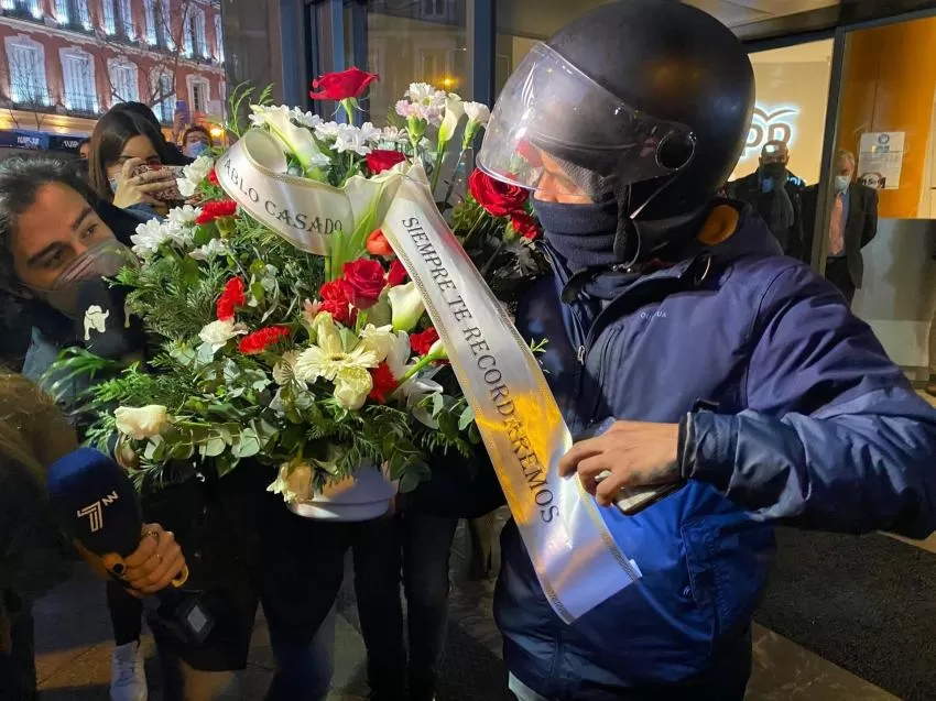 Además, uno de los congregados ha querido entregar en 'Génova' una corona de flores con la frase "Pablo Casado siempre te recordaremos", aunque no le han dejado entrar, y un grupo de mariachis también se ha acercado interpretando la canción 'Cielito lindo'. También se han escuchado gritos en contra de la dirigente regional.