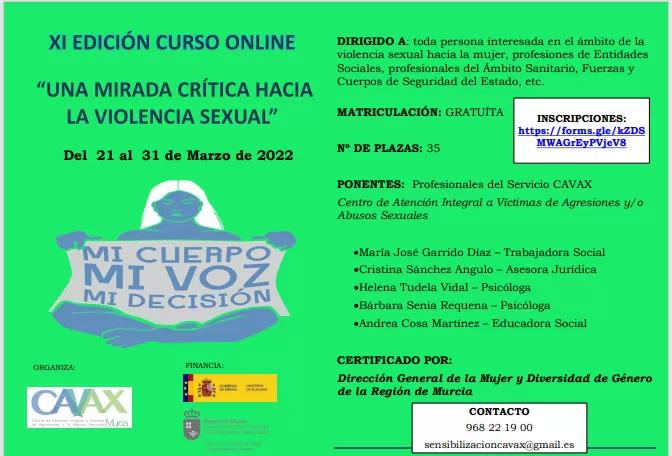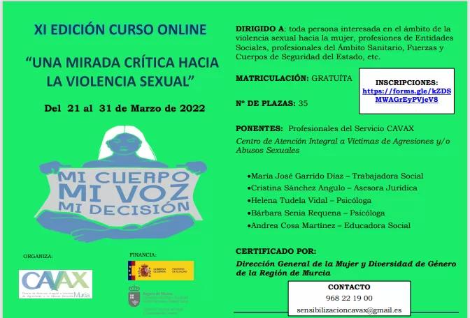 La Consejería de Mujer, Igualdad, LGTBI, Familias y Política Social, a través de la Dirección General de Mujer y Diversidad de Género, ha puesto en marcha la XI edición del curso 'Una mirada crítica hacia la violencia sexual', que comenzará el 21 de marzo y es de carácter gratuito, informaron fuentes de la Comunidad en una nota de prensa.