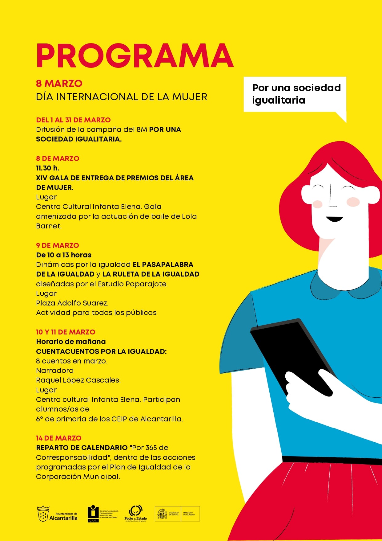 Además de la lectura del manifiesto 8 de Marzo, en Alguazas se han preparado una lectura de cuenta cuentos en la biblioteca municipal y una marcha por el Día Internacional de la Mujer que tendrá lugar este domingo 13. Para ver el programa de actividades en Alguazas hasta abril, puedes acceder desde este enlace.