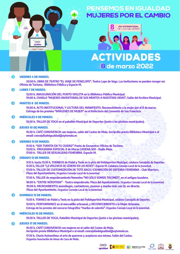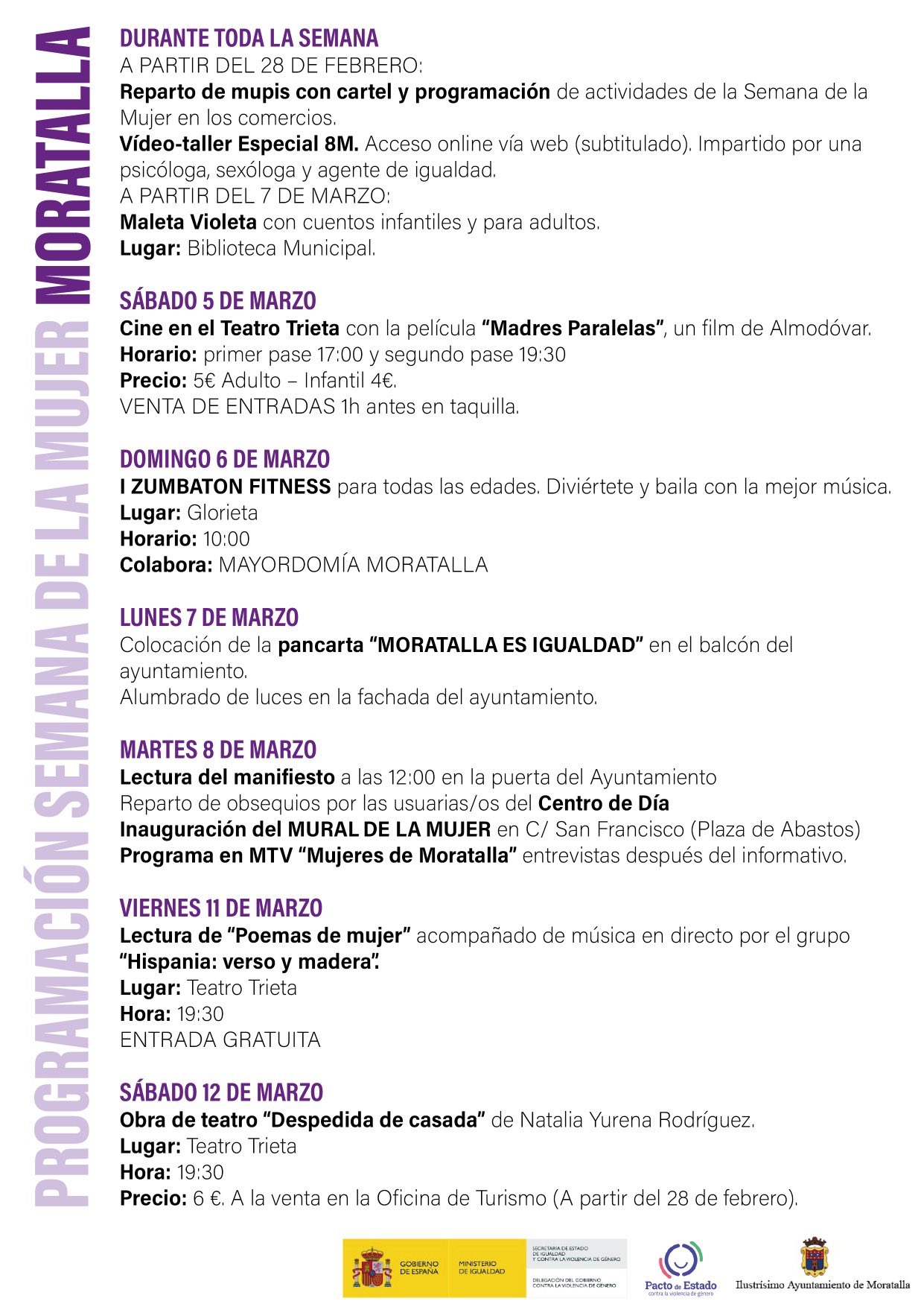 La Concejalía de Igualdad de Moratalla ha preparado una amplia programación de actos para conmemorar la Semana de la Mujer de Moratalla en la que se llevarán a cabo campañas informativas, actividades culturales como video talleres, proyección de películas, teatro, lecturas de poemas. Puedes mantenerte al día a través de su Twitter.