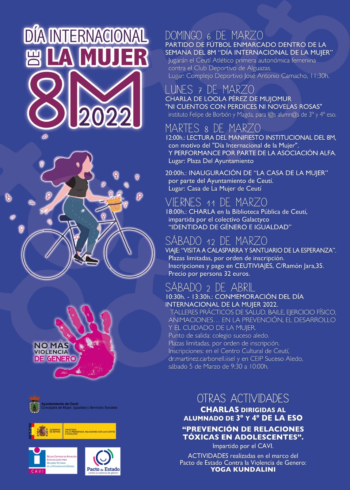 Desde el Ayuntamiento de Ceutí, además de la lectura del Manifiesto Institucional del 8M, han preparado varias charlas y talleres en pro de la igualdad de genero. Puedes consultarlo en el cartel que acompaña a este párrafo o en el Facebook del Ayuntamiento de Ceutí.