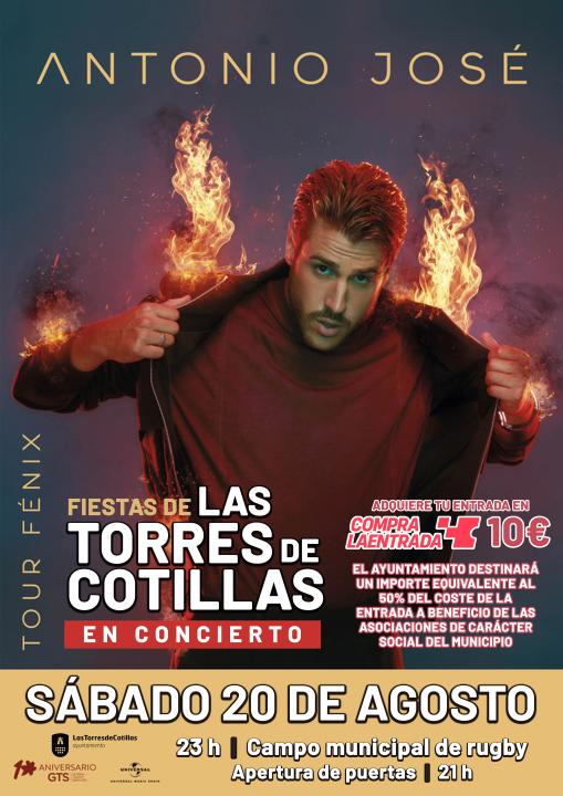 El "Tour Fénix" de Antonio José hará parada en Las Torres el sábado 20 de agosto. Las entradas, disponibles en la página web CompraLaEntrada, tienen un coste de 10 euros aunque el Ayuntamiento destinará un importe equivalente al 50% de la entrada a beneficio de las asociaciones de carácter social del municipio.